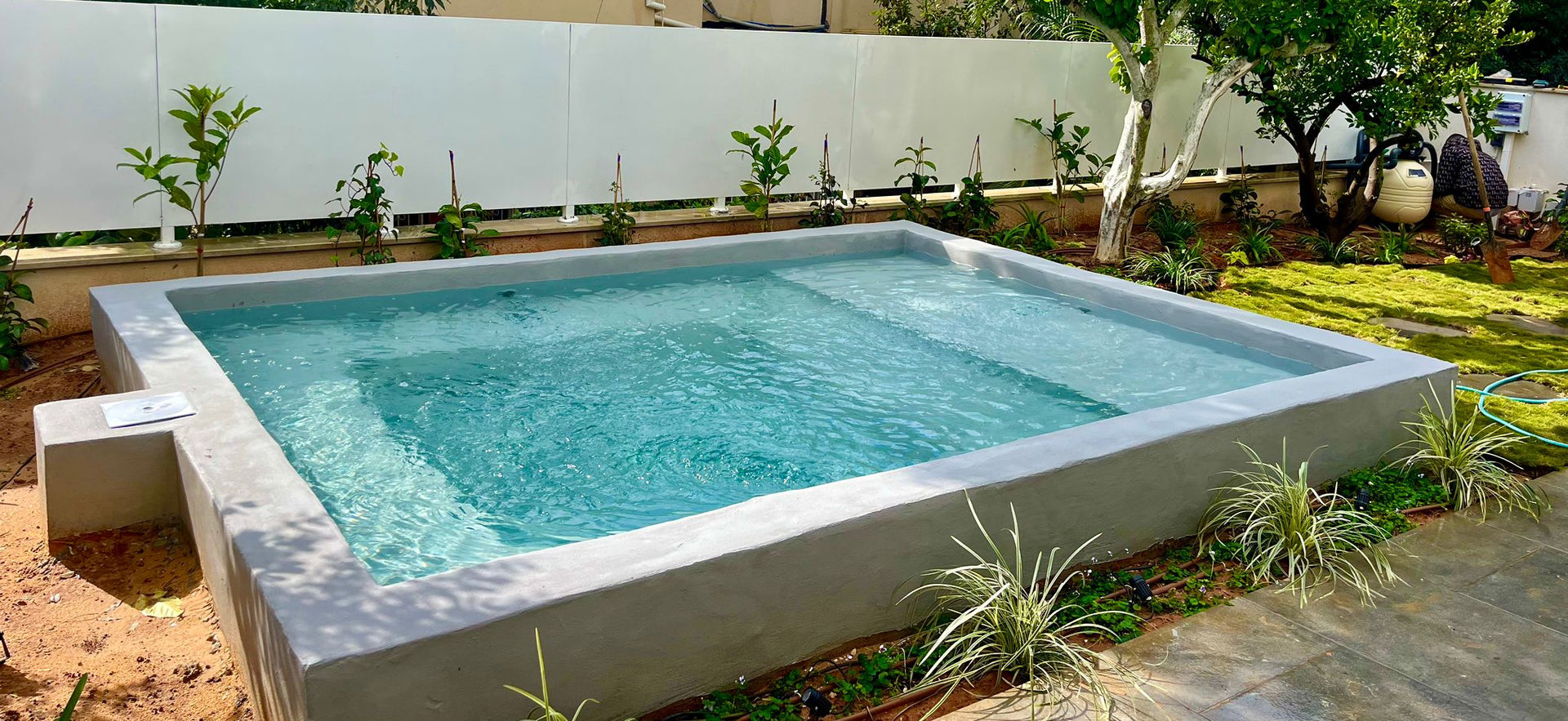 בריכת שכשוכית אבל הפעם מרובעת. וכן מאותם חומרים, מה שמקנה לה בסוף מראה של בריכה טבעית, עם ישיבה מדורגת במים, ספסל מסביב, וסוג של חומה להגנה על ילדים קטנים שלא חלילה יפלו פנימה.
