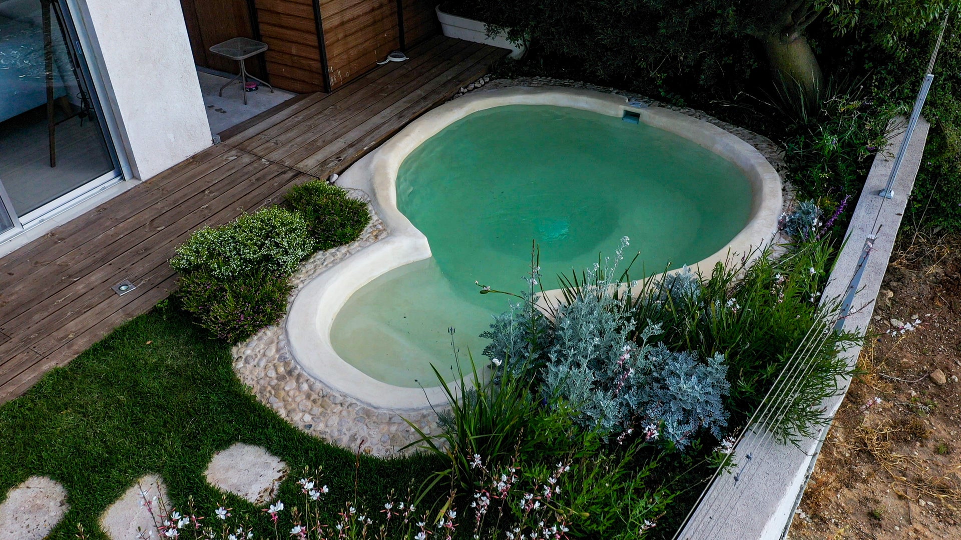 הלקוחות חלמו על השכשוכית הזו לאחר שבילו בחופשה בדרום. הם באו מאוד מגובשים וידעו בדיוק איך הם רוצים שהכל יראה. רוחב הגינה היה צר והקוטר המרבי של השכשוכית יכל להיות רק 3 מ' ובשביל לנצל שטח נוסף בגינה חיברנו עוד חלק, שהקוטר שלו מטר, ויצרנו ממנו כניסה עם מדרגות למים. זוהי שכשוכית בצורת מעיין עם ספסל מעוגל הבנוי לכל אורכה, בעומק של 60 ס"מ שיוצרת שכשוכית ישיבה.